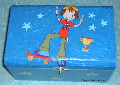 Este baú em madeira foi pintado com tintas Camurcyl em tons azuis para imitar o mar, utilizei as seguintes técnicas: textura acrílica na tampa com ondulações e a técnica esponjada com detergente na parte interna, explico abaixo. Na parte de fora colei papel para decoupagem e estrelas fluorescentes. A máquina modifica muito o trabalho e estas fotos foram feitas em máquina com defeito. Mas ficou muito bom o trabalho.